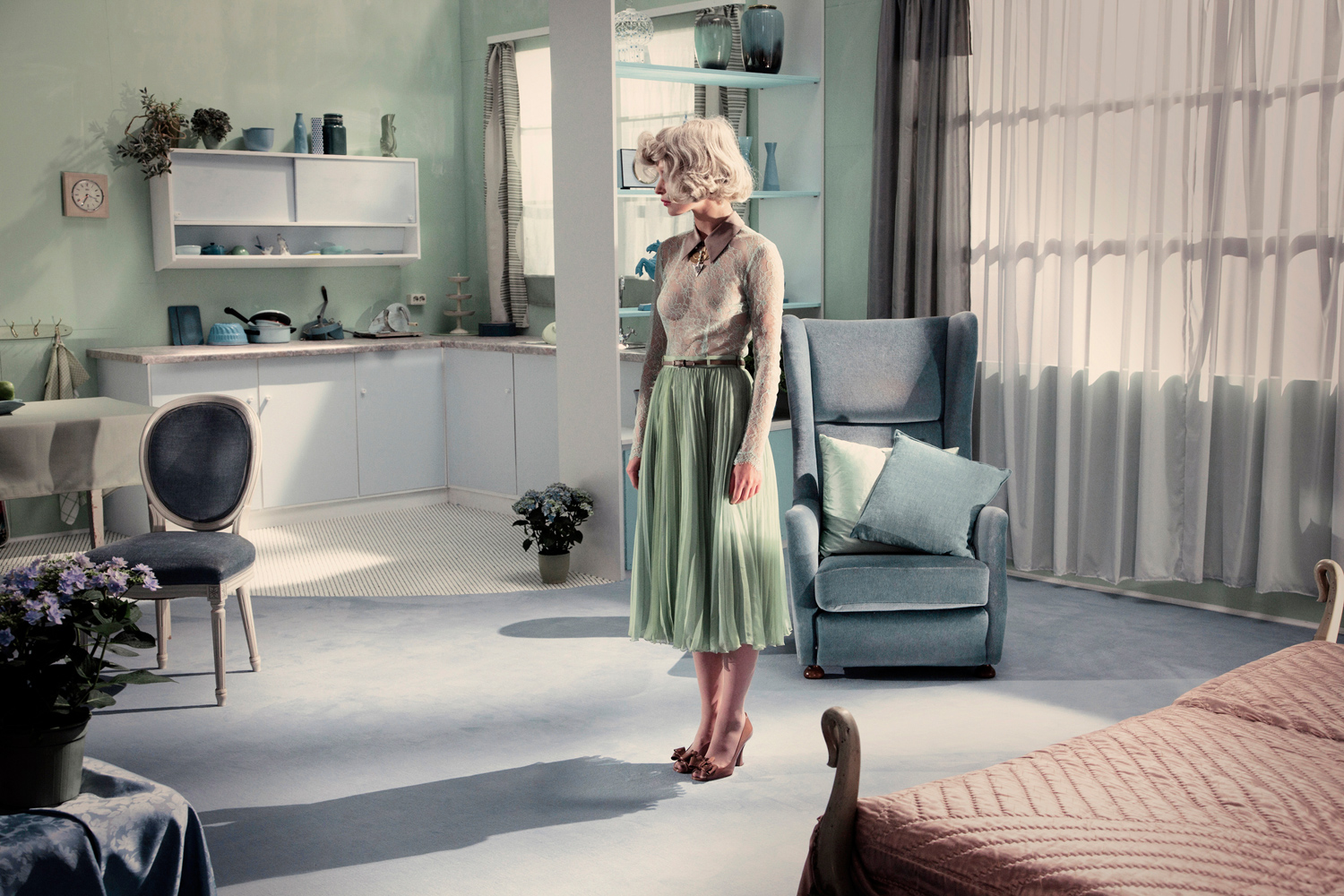 Before I start working on a new project, I already have everything visualized precisely in my mind: I know what the model will wear from head to toe, and I know what the scenery should look like. That is why I am very hands-on when it comes to styling. I have a fixed team that I work with very closely, and that includes all aspects of style. We choose every stylistic element that appears in my film or on my photos. Every single piece – no matter if it’s shoes, the color of the flowers or the shape of the curtains – is determined in advance, so that there are no surprises on the set.